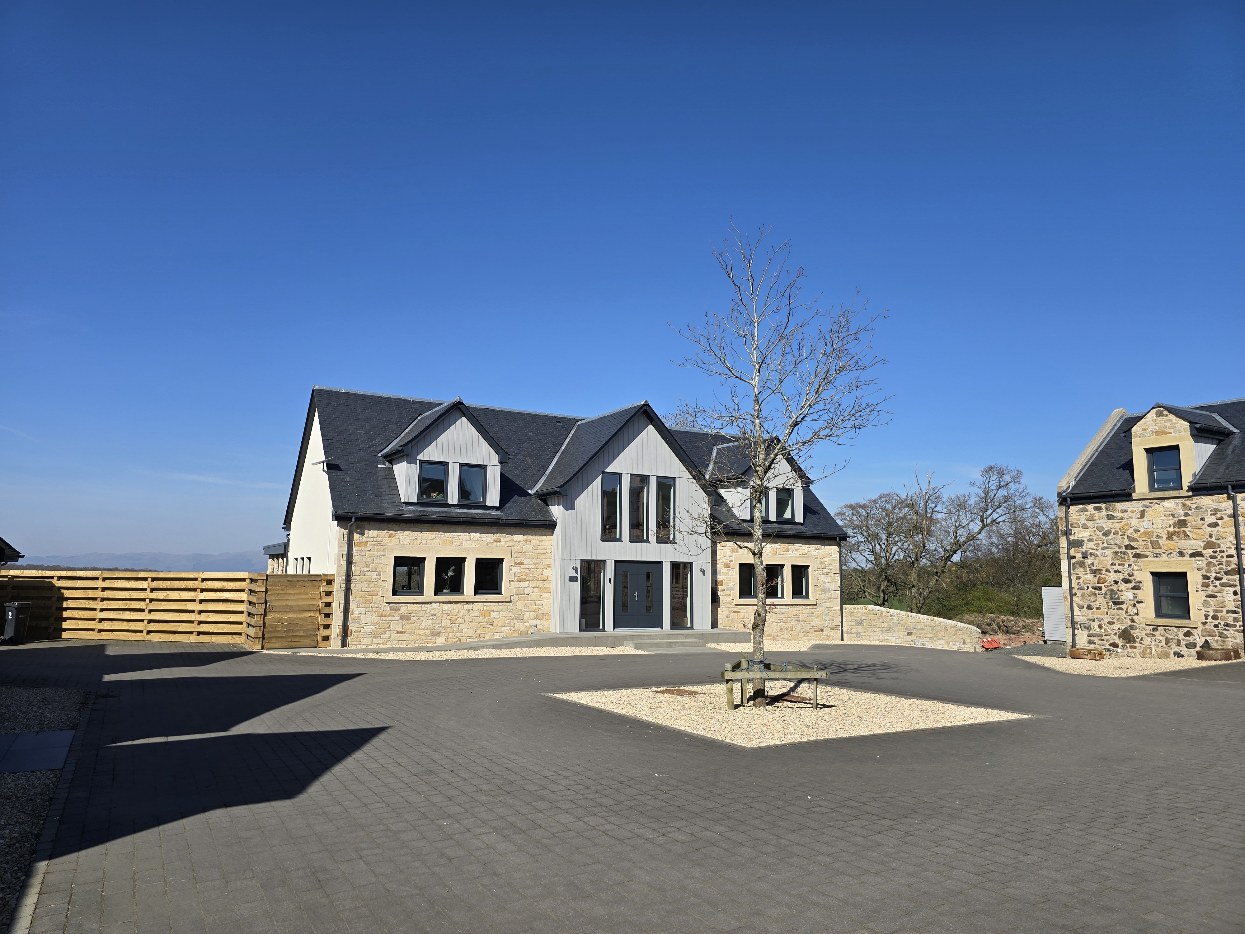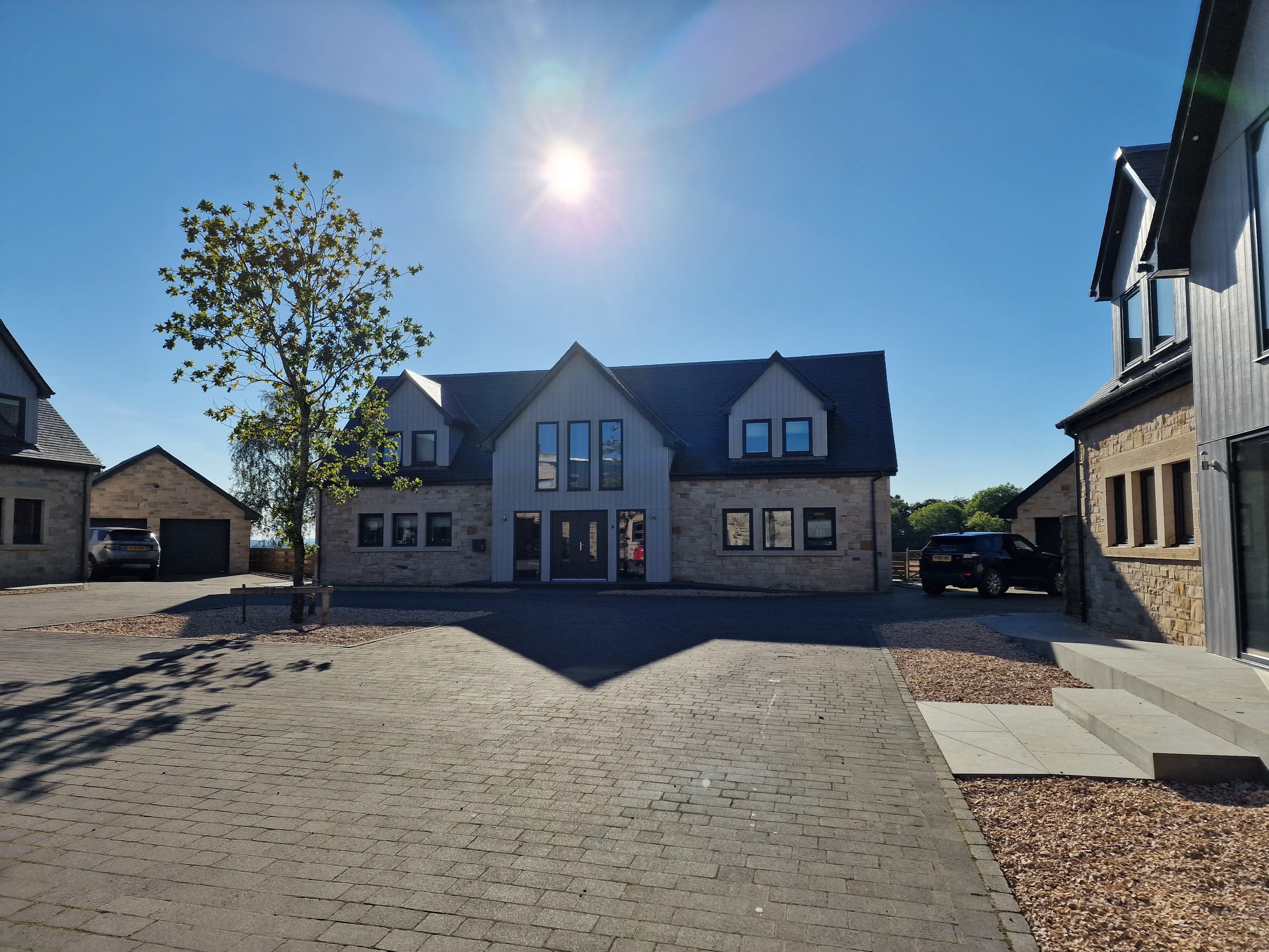 The project involved the demolition of disused agricultural buildings and the creation of three new detached dwellings, alongside two sympathetic barn conversions. Arranged around a shared landscaped courtyard, the layout fosters a sense of community while preserving privacy and open outlooks. The architecture strikes a balance between rural character and modern design — with natural stone and slate used throughout to reflect the traditional materials of the area, softened with light grey cladding and contemporary grey-framed windows and doors.